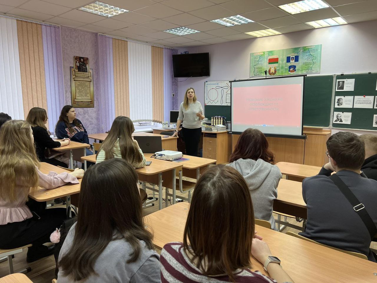 24 февраля 2024 года заведующий юридической консультацией г. Новополоцка Гриневич Е.В. выступила с лекцией перед учениками 7 класса УО "СШ №6 г. Полоцка" и их родителями. На лекции также присутствовали педагоги. Адвокат рассказала об ответственности несовершеннолетних за совершение административных правонарушений и уголовных преступлений.