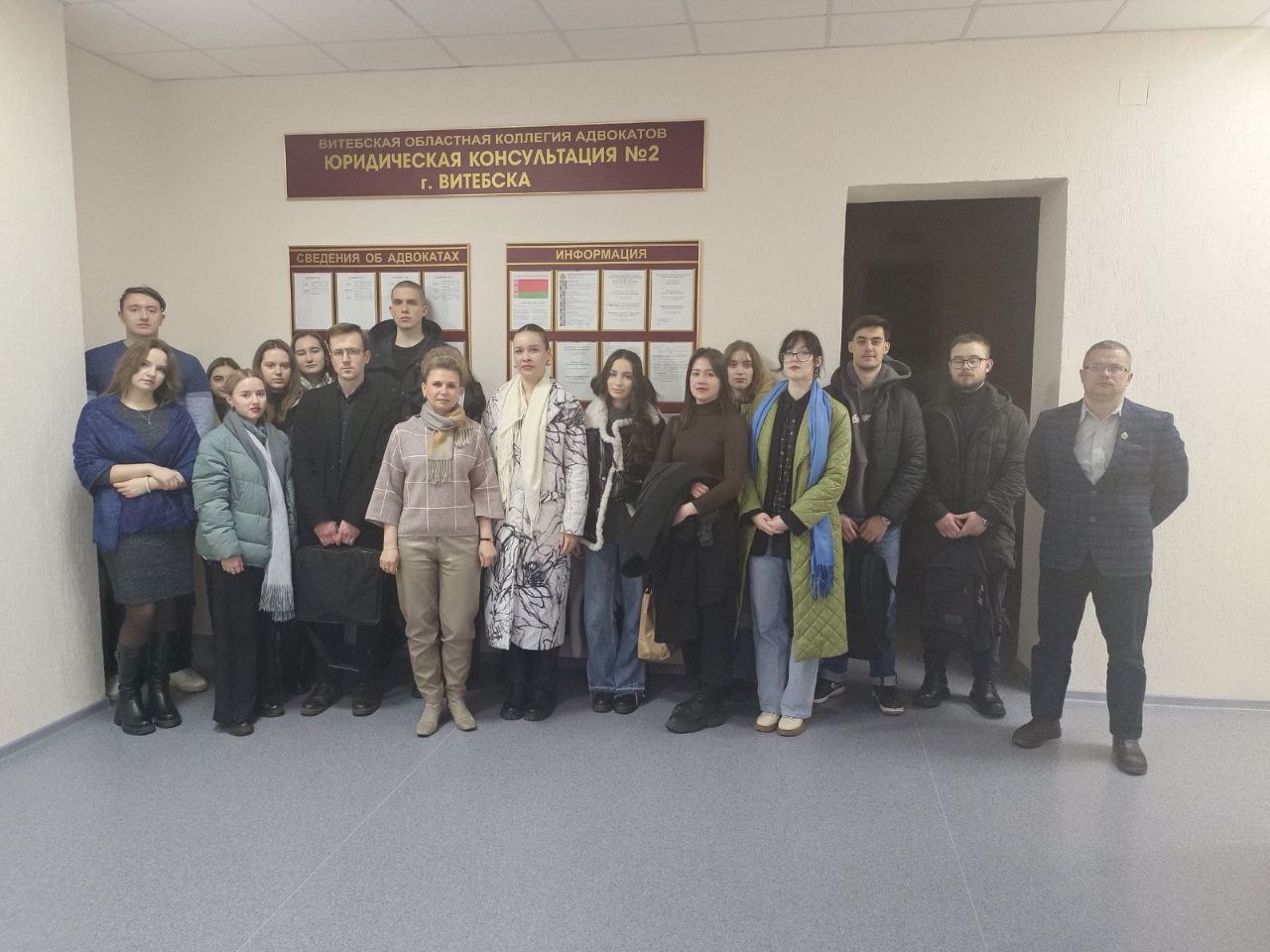 23 февраля 2024 года на базе юридической консультации №1 г. Витебска в рамках договора о сотрудничестве между УО "Витебский государственный университет им. П.М. Машерова" и Витебской областной коллегией адвокатов прошло занятие со студентами 2 курса юридического факультета.