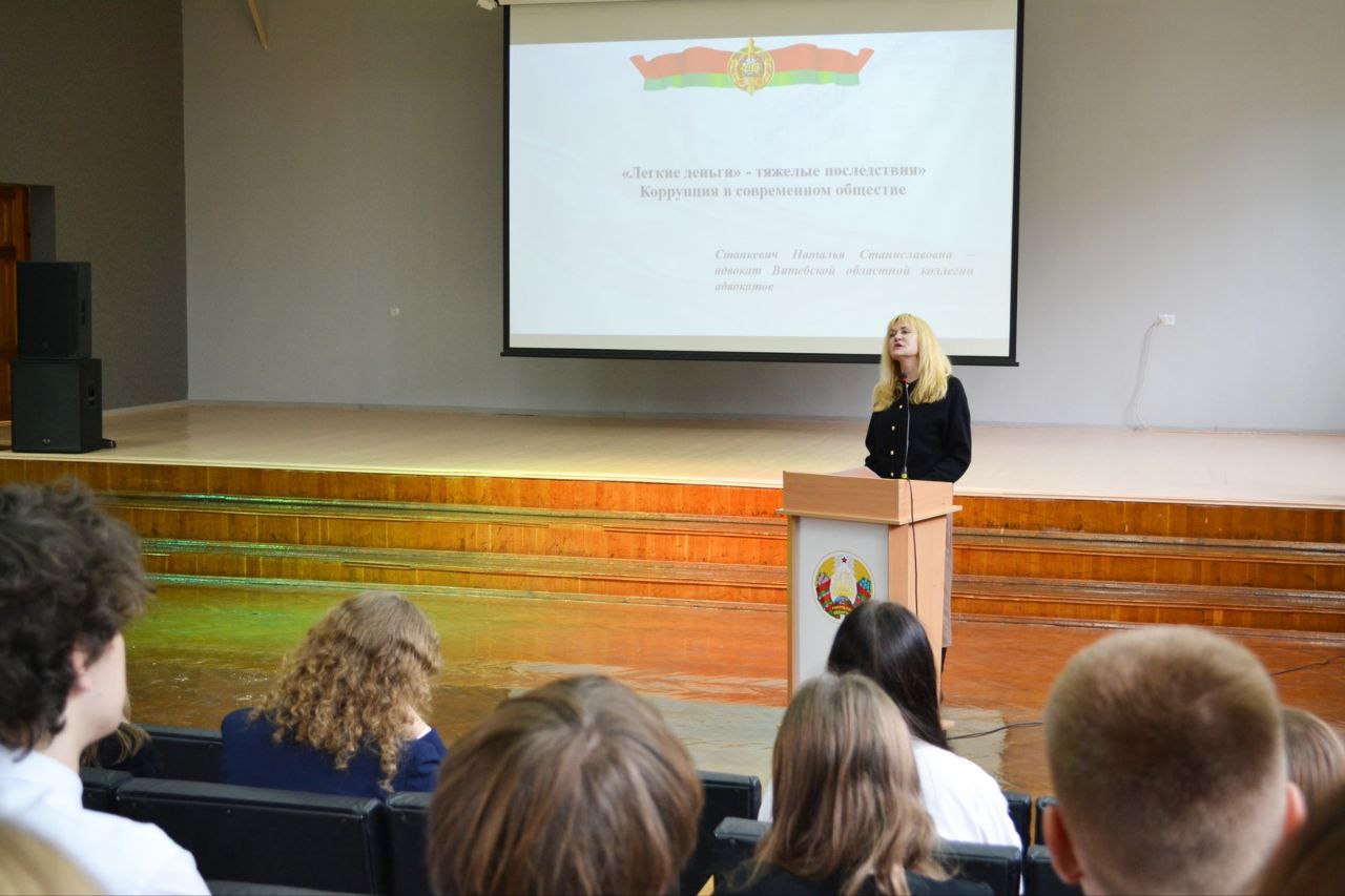 15 октября 2024 года адвокат юридической консультации №2 г. Витебска Станкевич Наталья выступила с лекцией в государственном учреждении образования «Гимназия №8 г. Витебска» на тему: "Коррупция". Адвокат рассказала ученикам 10 и 11 классов, а также преподавателям о понятии коррупции и её общественной опасности, о субъектах преступлений данной категории дел, а также об ответственности за совершение коррупционных преступлений.