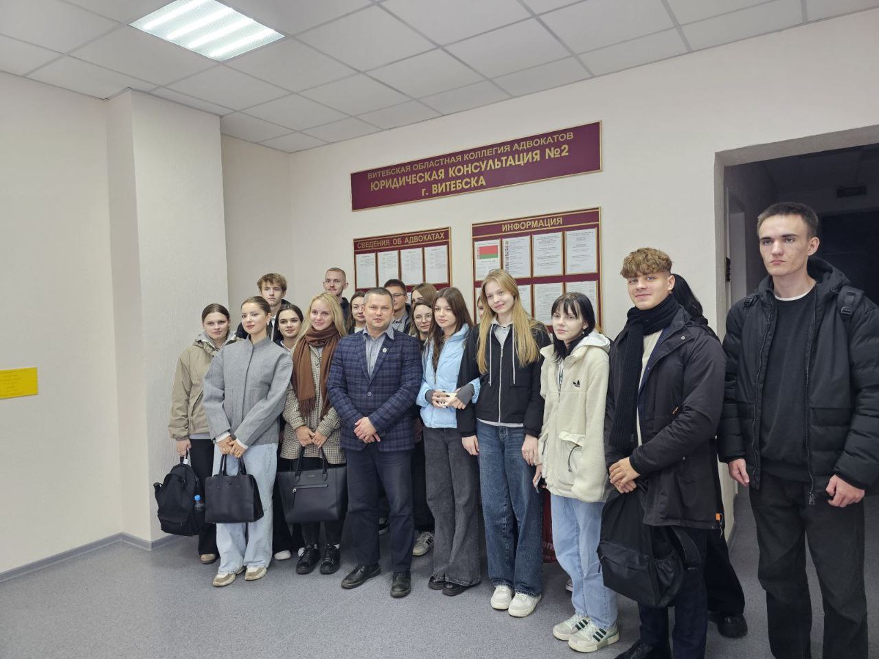 18 октября 2024 года на базе юридической консультации №1 г. Витебска в рамках договора о сотрудничестве между УО "Витебский государственный университет им. П.М. Машерова" и Витебской областной коллегией адвокатов прошло профориентационное занятие со студентами 2 и 3 курса юридического факультета.