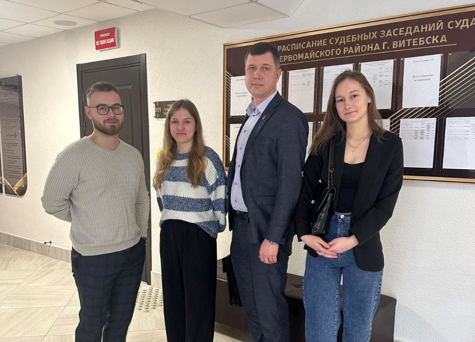 19 февраля 2025 года совместно с адвокатом юридической консультации №1 г.Витебска Ястребом Денисом в судебном заседании в суде Первомайского района г. Витебска при рассмотрении дела об административном правонарушении присутствовали студенты 4 курса юридического факультета ВГУ имени П.М.Машерова.